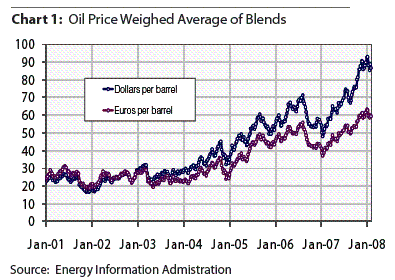 There are two forces driving oil prices. The first is a fundamental limitation on our ability to flow oil out of the Earth. We’ve used much of the cheap oil and what is left is sour, heavy, and hard to recover and process. As we can see from this figure, which shows data from the US Energy Information Agency, World Crude Oil Production reached a peak in May, 2005 and has been flat since while world wide demand has continued to increase.